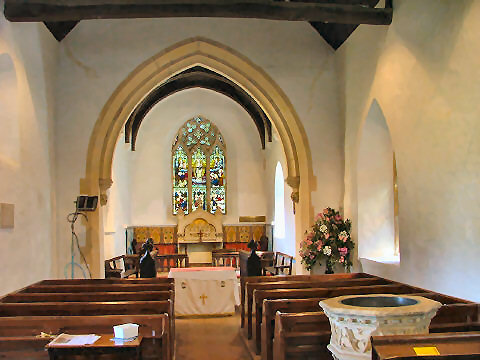 A farmyard church which does not feature highly on the ecclesiologist`s league tables, but which is packed with atmosphere and a sense of history. Consisting of nave and chancel with a north porch, Ridley church has stood the test of time. A fine Norman window in the north wall testifies to its origins high on the Downs. It is unusual to step up into a church - usually the ground outside has risen over the years - but this sparsely inhabited hamlet can never have seen many burials, Nothing much has happened to the building since it was built, apart from the inevitable Victorian improvements - mostly of a benign nature here. The glass in the west window presents a curious appearance undoubtedly leading some to think that it is medieval, but it is in fact poorly fired Victorian glass that has weathered.`